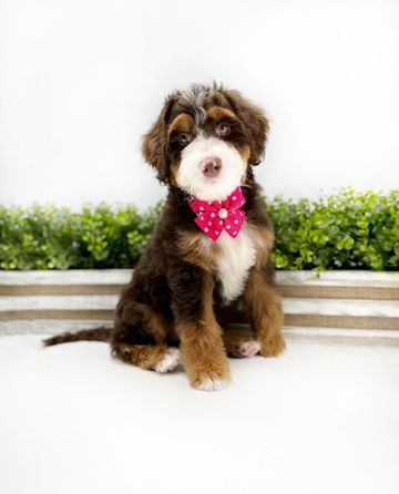 Bear is our, Brown Tri, Mini Bernedoodle Stud. Along with intense tri makings, Bear carries two copies of brown! In addition to his unique and handsome appearance, Bear’s personality could stand alone. Along with a calm demeanor, Bear’s intelligence continues to impress us. We are very proud of this addition to our program.